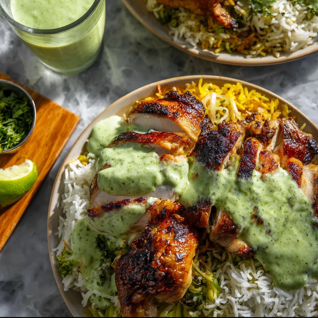 10. Serve the chicken over the rice and drizzle generously with green sauce. Add extra sauce on the side for dipping.