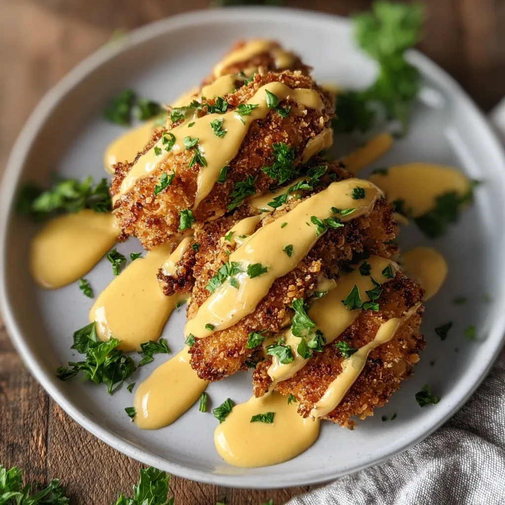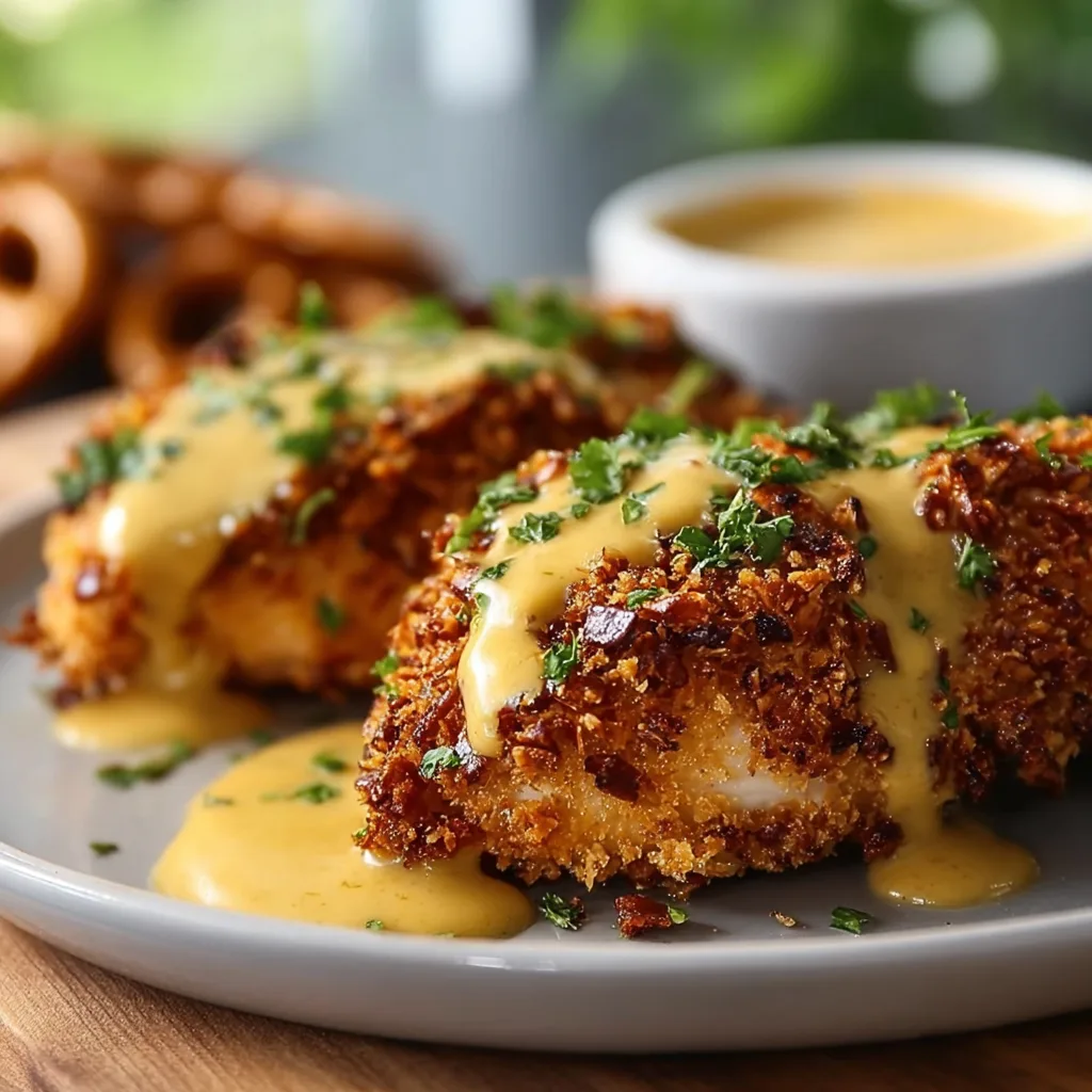 Crispy pretzel-coated chicken drizzled with a tangy mustard-cheddar sauce for a flavorful, family-friendly dinner.