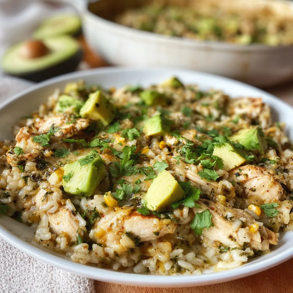 The recipe draws inspiration from traditional Mexican flavors while leaning into the practicality we all crave on weeknights. Think tender chunks of chicken simmered in tangy salsa verde, fluffy rice that soaks up every bit of that savory sauce, black beans for heartiness, sweet bursts of corn, and a gooey blanket of melted cheese on top. To finish, creamy avocado and a sprinkle of fresh cilantro bring brightness to every forkful.