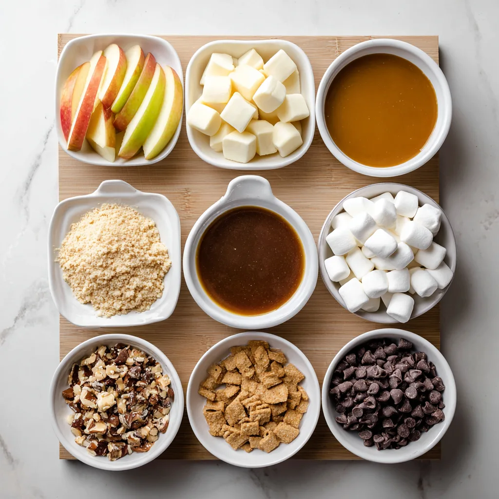 - Sprinkle marshmallows, chocolate chips, nuts, and graham crackers on top.