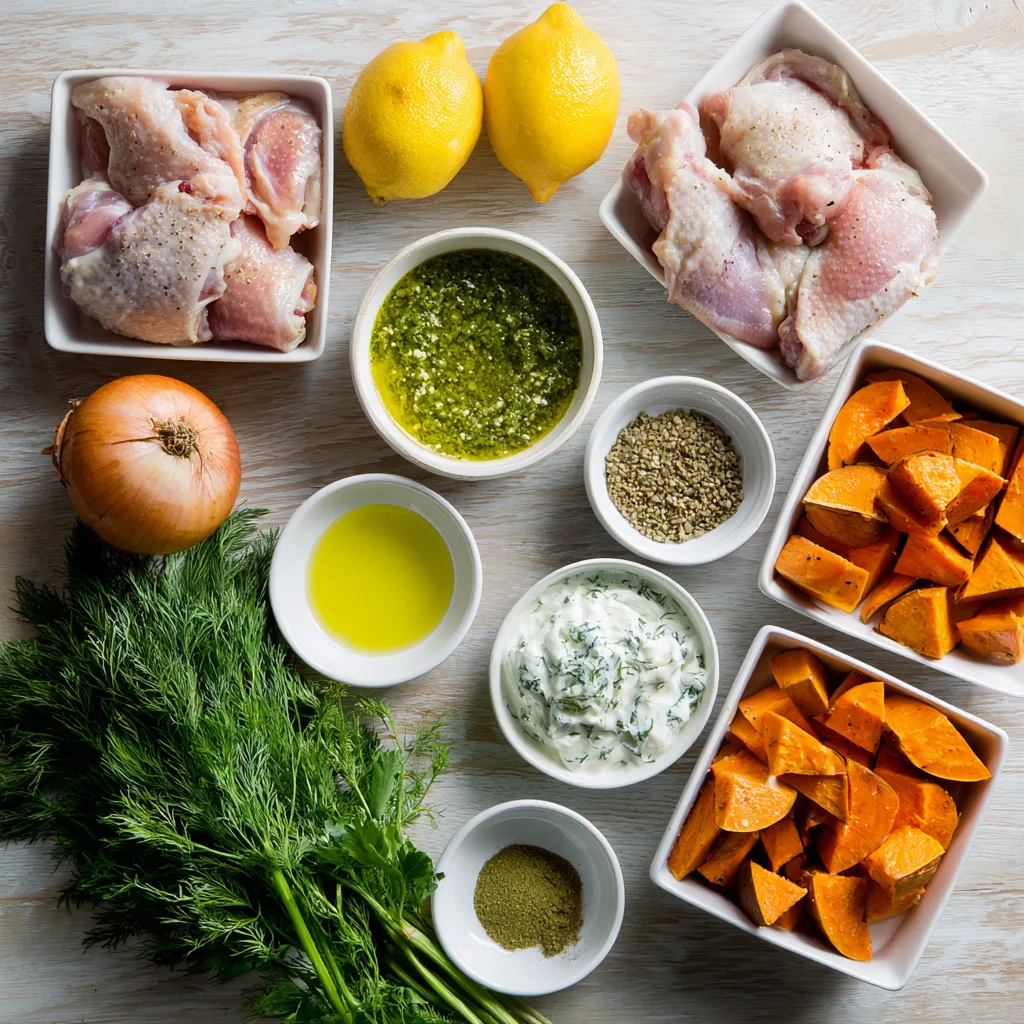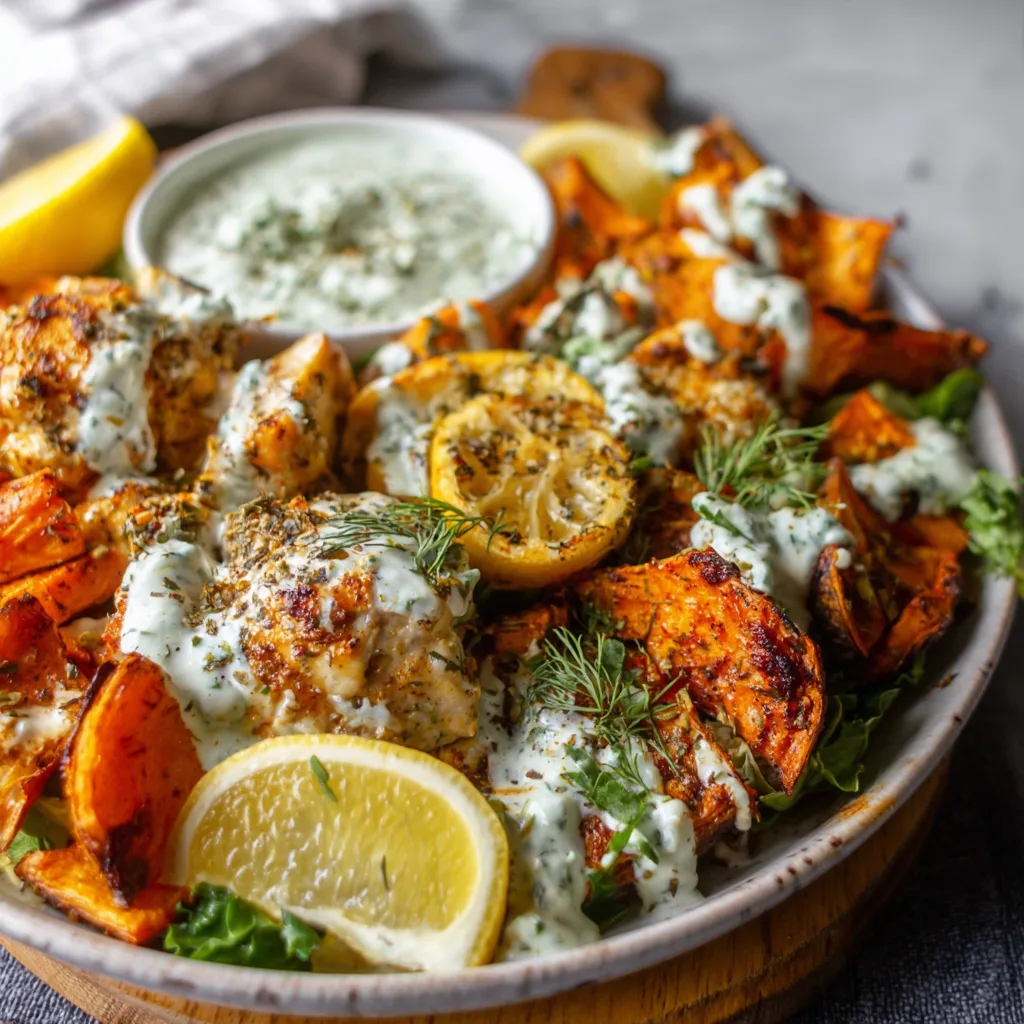 This dish takes inspiration from Greek and Mediterranean kitchens, where simple ingredients shine when paired thoughtfully. Juicy chicken is roasted with warm spices, garlic, and lemon, while sweet potatoes caramelize in the oven until tender on the inside and crisp around the edges. The final touch—a cool, creamy tzatziki—ties everything together with freshness and balance.