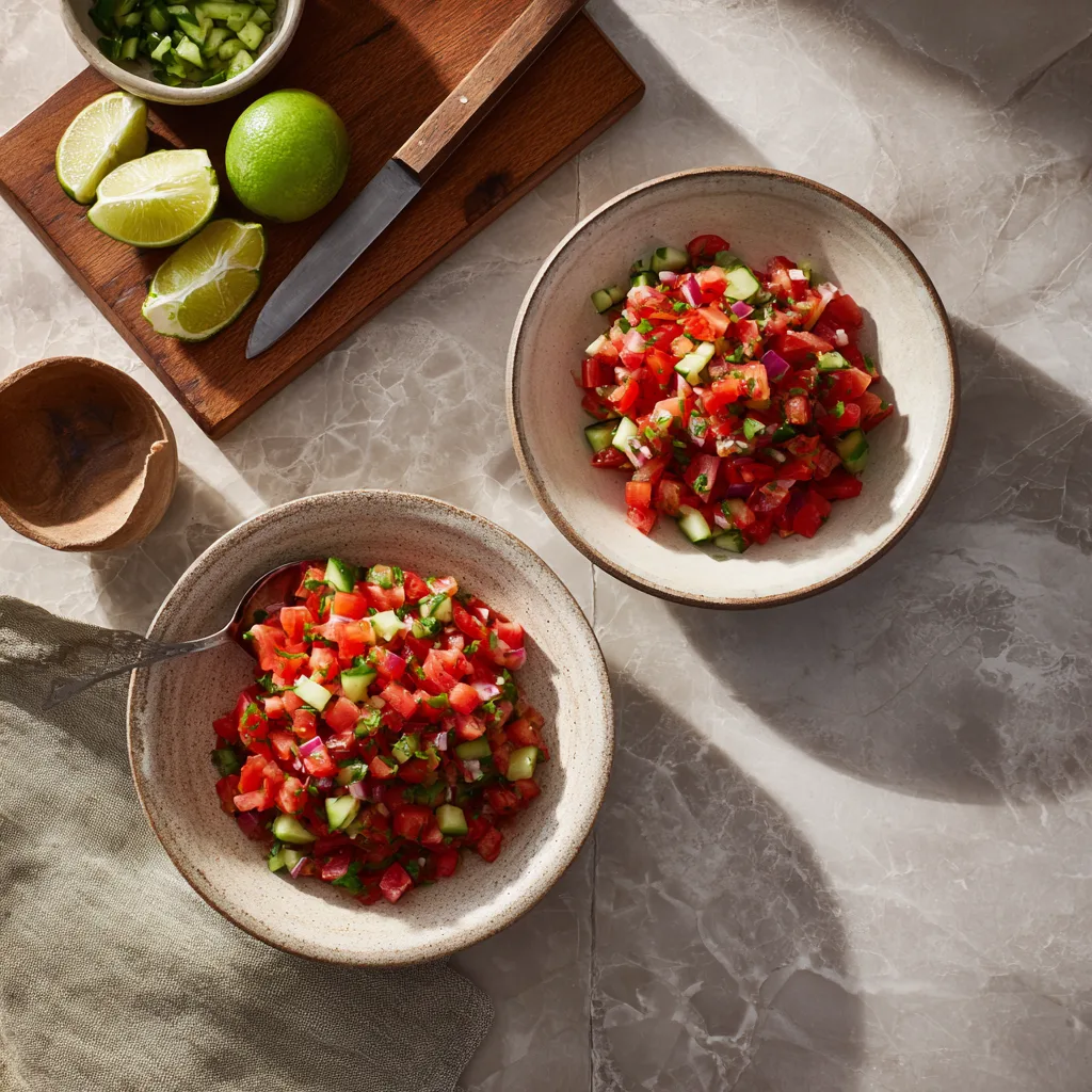 Unlike rustic chopped salads with large chunks, Shirazi Salad is finely diced. Each ingredient is cut into small, uniform pieces so that every spoonful contains a perfect combination of cucumber, tomato, and onion. This careful chopping technique transforms the salad into something light yet satisfying.