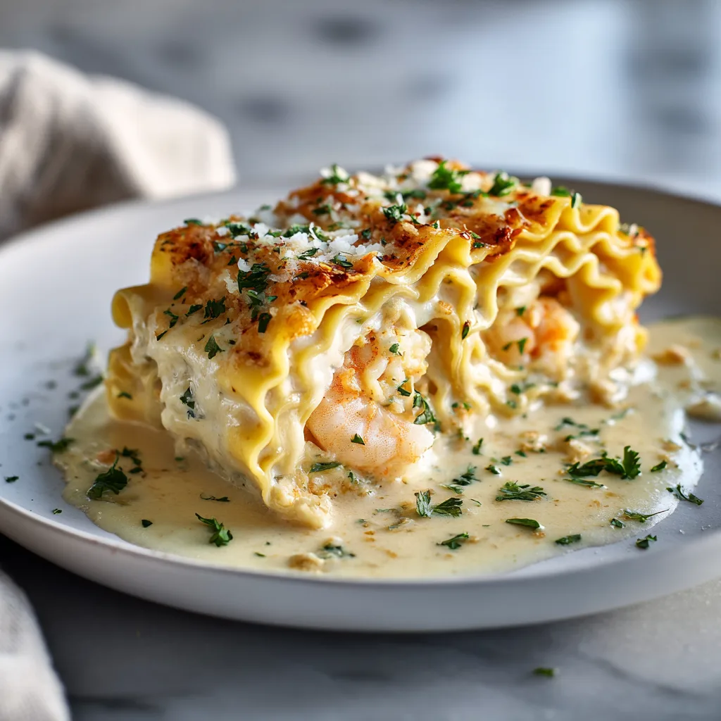 Imagine tender lasagna noodles rolled around a rich seafood filling, baked in a velvety Alfredo sauce, and topped with golden, bubbling cheese. Each bite is packed with delicate shrimp, sweet crab, and creamy goodness that melts together beautifully.