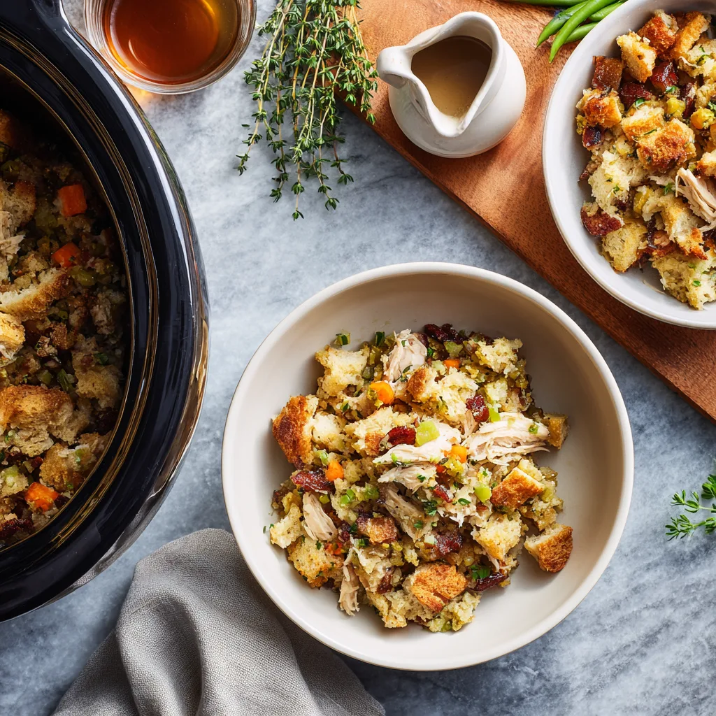 This particular dish works beautifully because the slow cooking process allows the chicken to stay juicy while the stuffing absorbs the flavorful broth and seasonings.