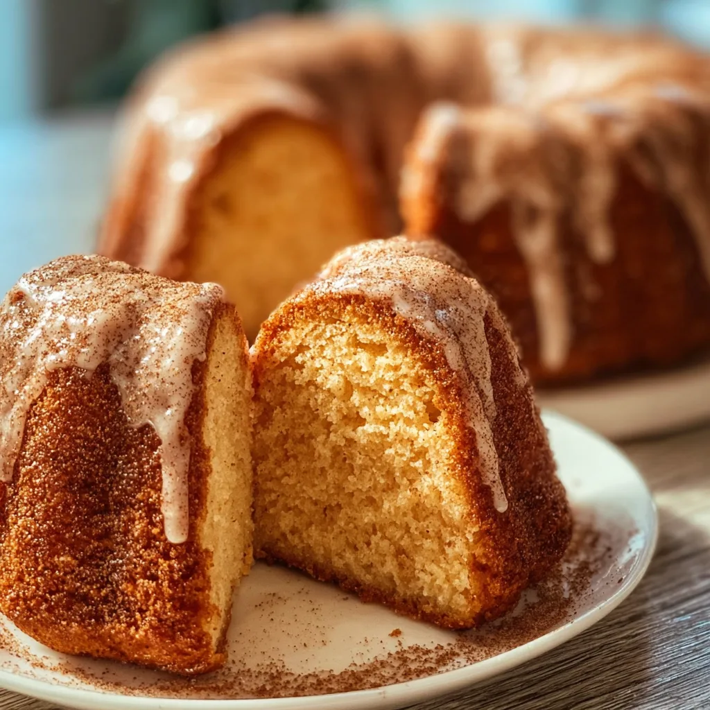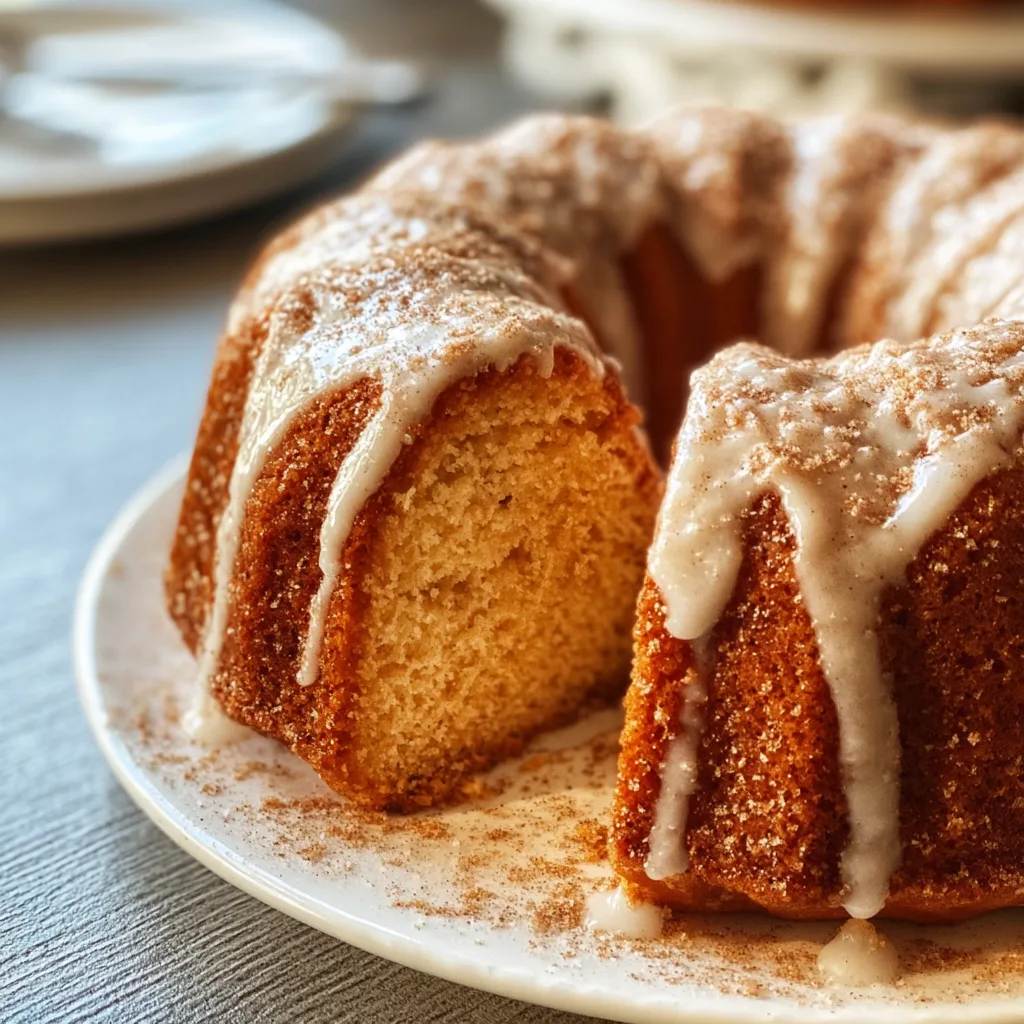 A moist, buttery Bundt cake infused with cinnamon and nutmeg, coated in cinnamon sugar, and drizzled with a sweet glaze.