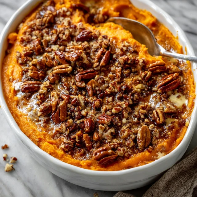- Sprinkle the pecan topping evenly over the sweet potato layer.