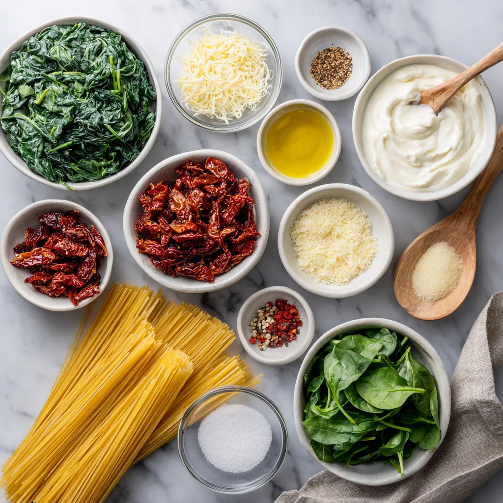 A creamy, flavorful spaghetti dish with sun-dried tomatoes and fresh spinach, ready in just 20 minutes.