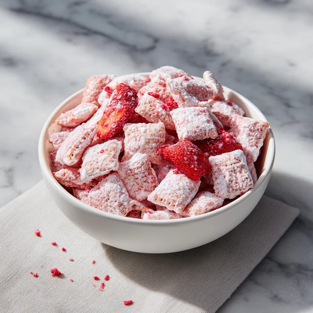 This strawberry shortcake puppy chow balances sweetness and texture beautifully.