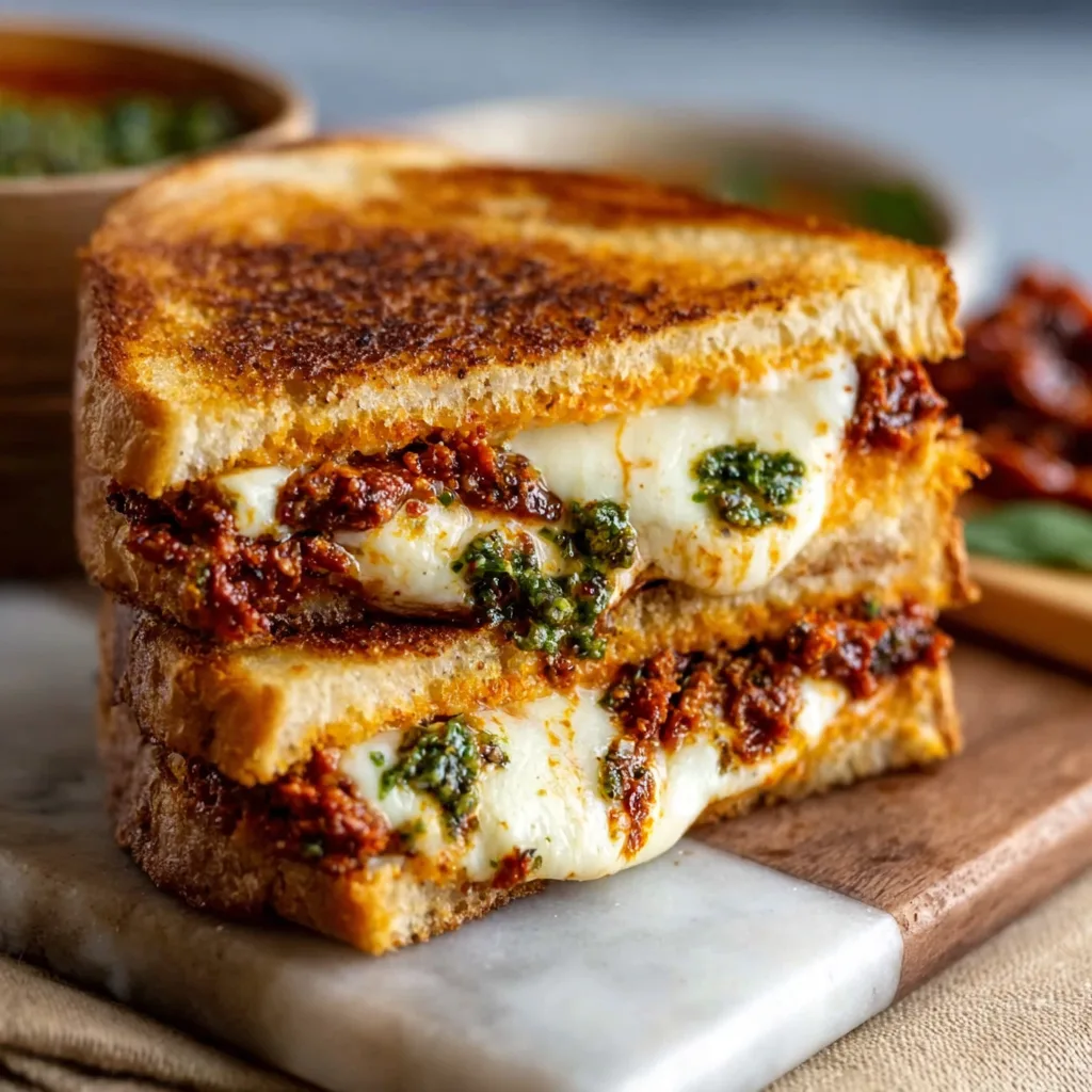 The first time I made this sandwich, it was purely accidental. I had leftover pesto in the fridge, a half-used jar of sun-dried tomatoes, and a serious craving for melted cheese. One bite in, and I knew this wasn’t just a “quick lunch” anymore—it was the sandwich. Savory, buttery bread. Herbaceous pesto. Sweet, tangy sun-dried tomatoes. And that perfect cheese pull that makes you pause before the next bite.