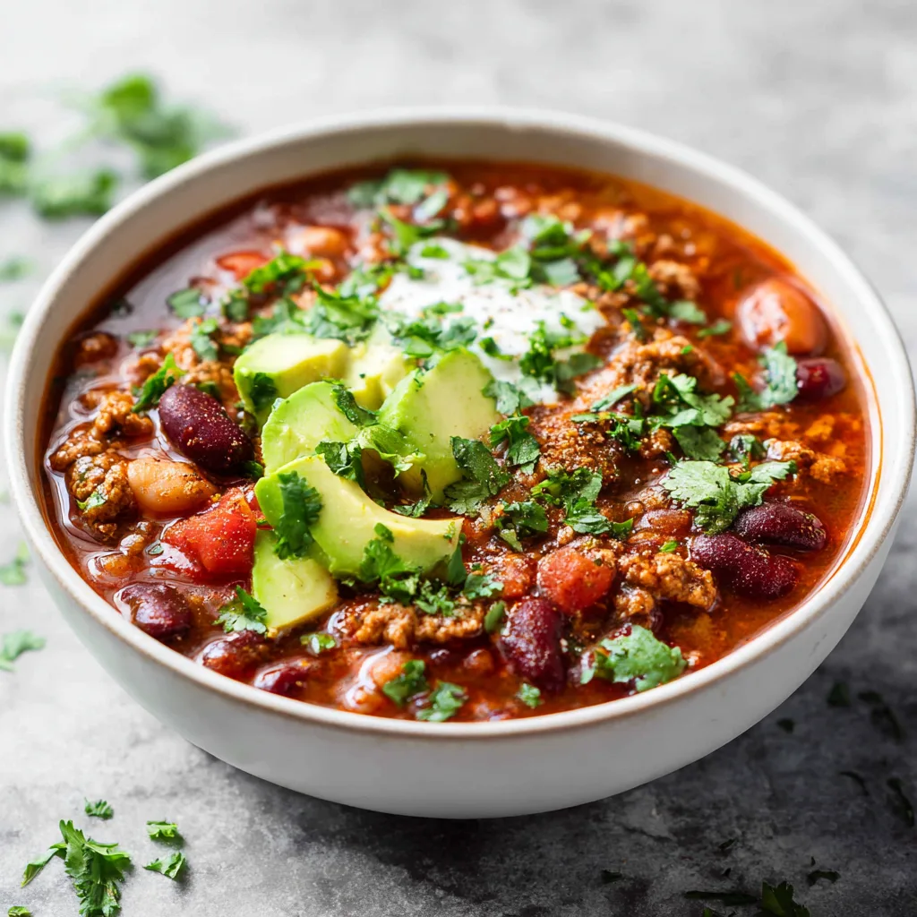 A hearty and nutritious chili made with lean ground turkey, beans, vegetables, and warm spices for a comforting high-protein meal.