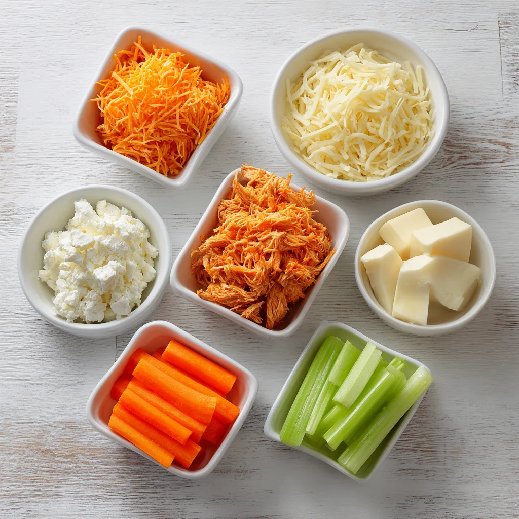 - In a large bowl, mix shredded chicken, buffalo sauce, mozzarella, cream cheese, carrots, and celery until well combined.