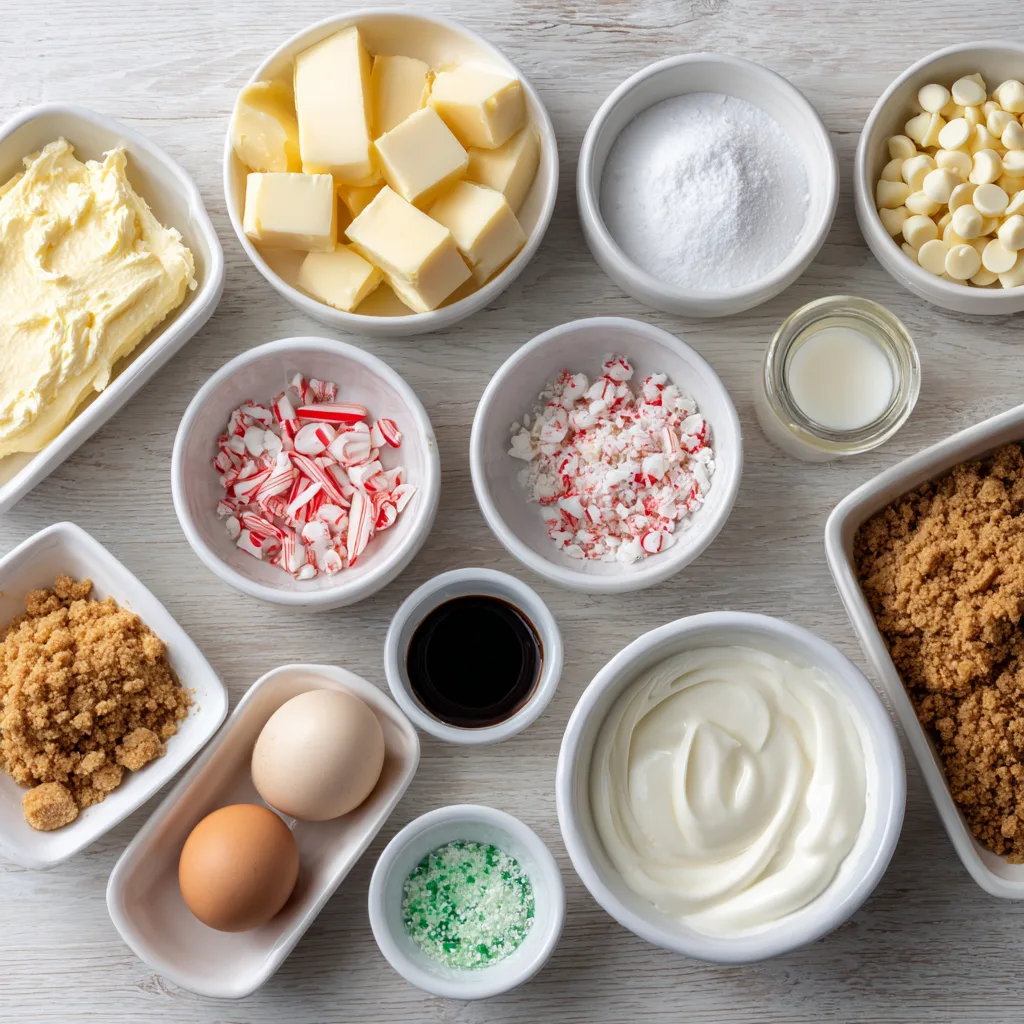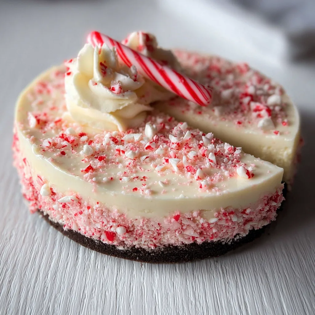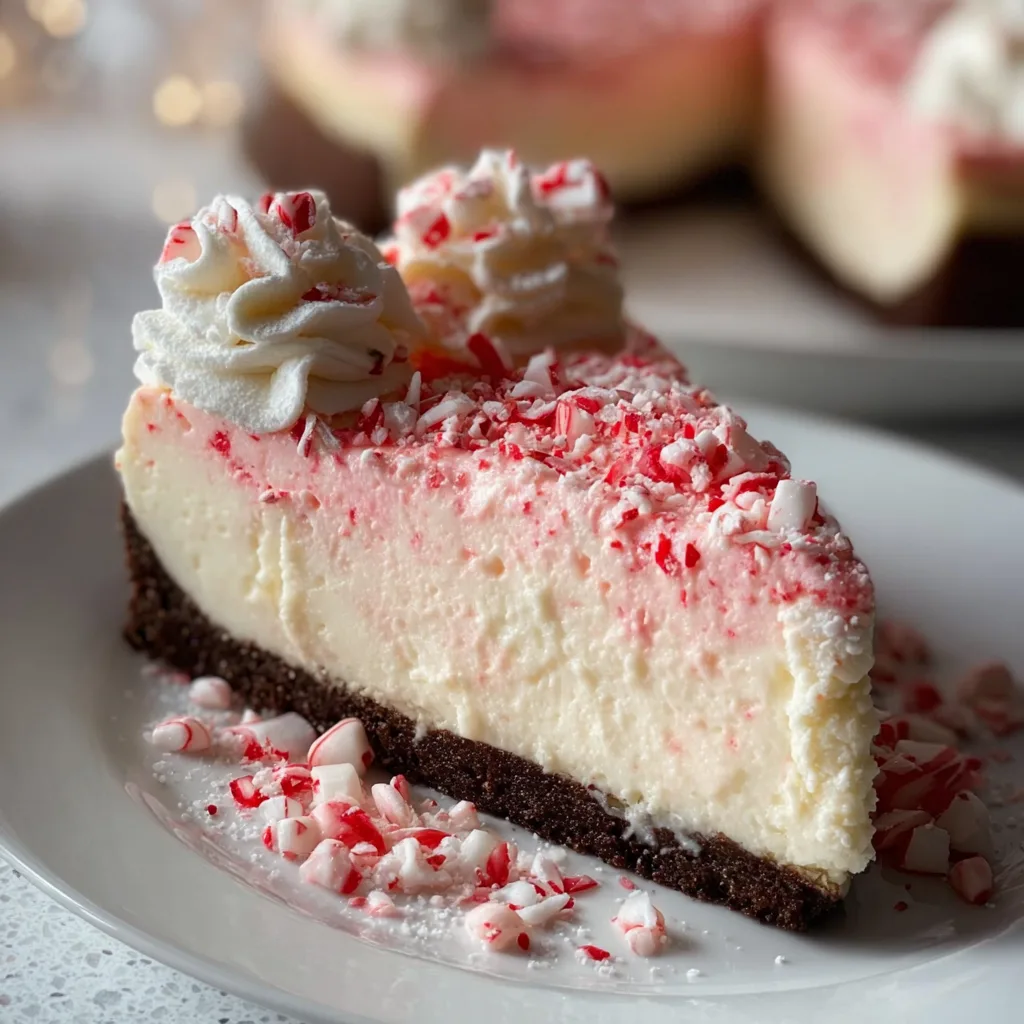 A creamy holiday cheesecake infused with white chocolate and peppermint, topped with crushed candy canes for a festive finish.