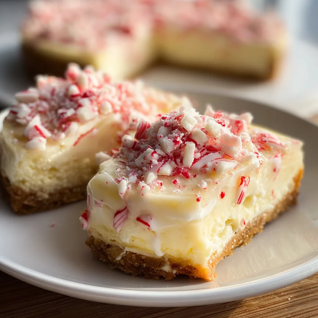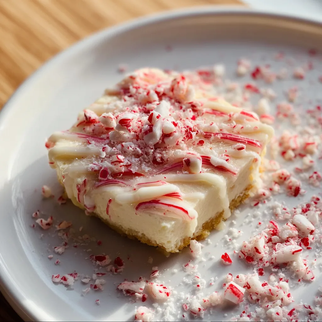 Creamy white chocolate cheesecake infused with peppermint and topped with crushed candy canes for a festive holiday dessert.