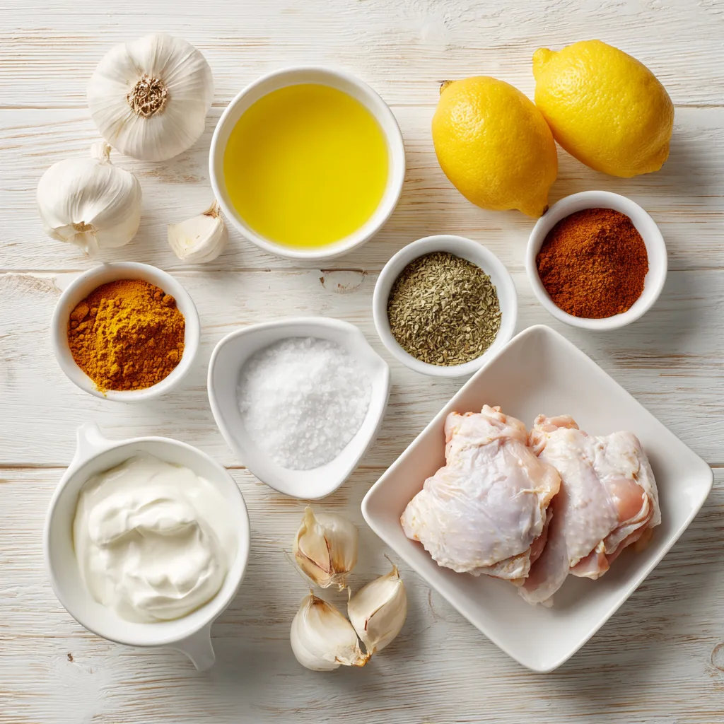 - In a large bowl, combine yogurt, olive oil, minced garlic, lemon juice, paprika, cumin, turmeric, coriander, salt, black pepper, and cayenne if using.